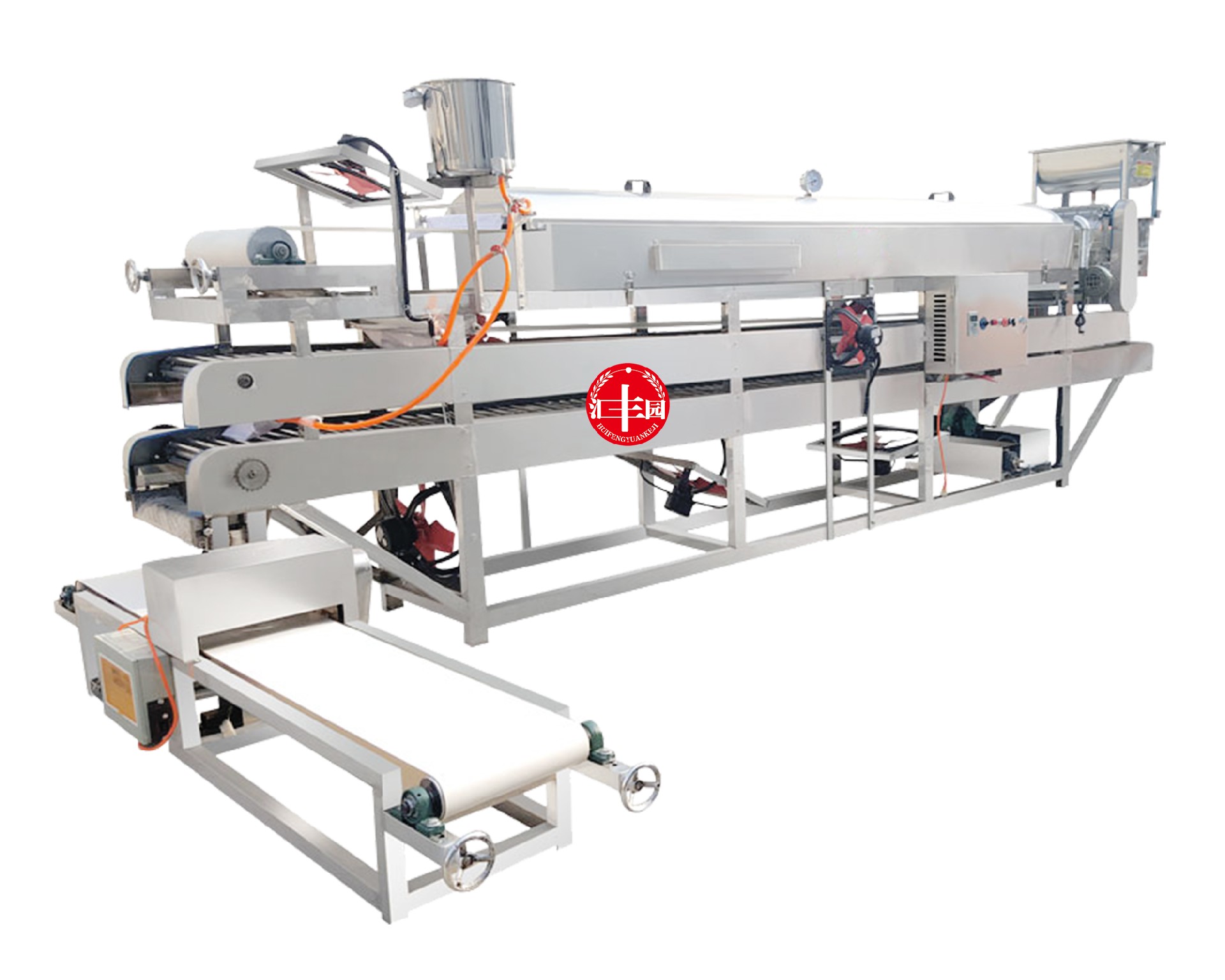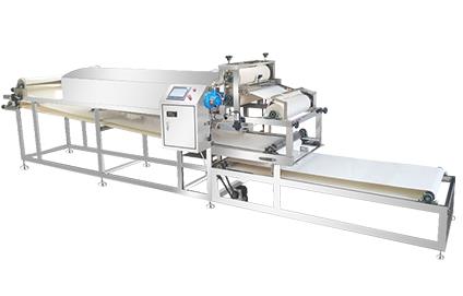 数控双层冷却凉皮机系全自动型,将面浆、米浆、淀粉浆等原料加入浆桶后,可以自动上浆,可生产:折叠张、切条等形状的制品,如凉皮、米皮、河粉、粉皮、米粉、大拉皮等。有时产200-3000斤凉皮(蒸箱长度2-15米)多种型号大小的凉皮机供您选择。本机机身及箱体采用优质不锈钢制造,变频控制、特氟龙布带、自动纠偏、自动刷油、双层传送冷却等操作简便,标配电加热,机器留有蒸气管道,可以外接发蒸汽锅炉等。机器切断功能为单选产品,需要另购买。