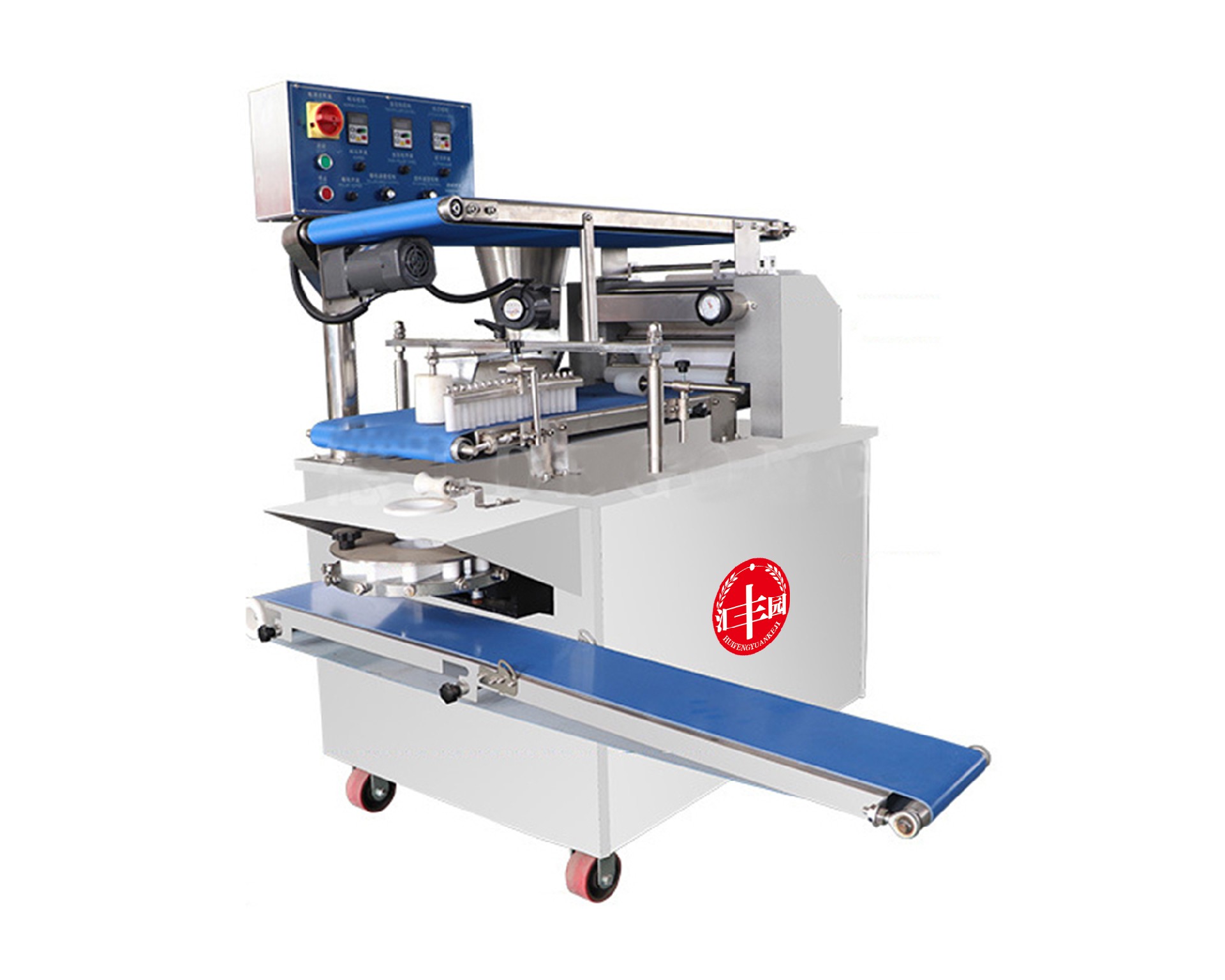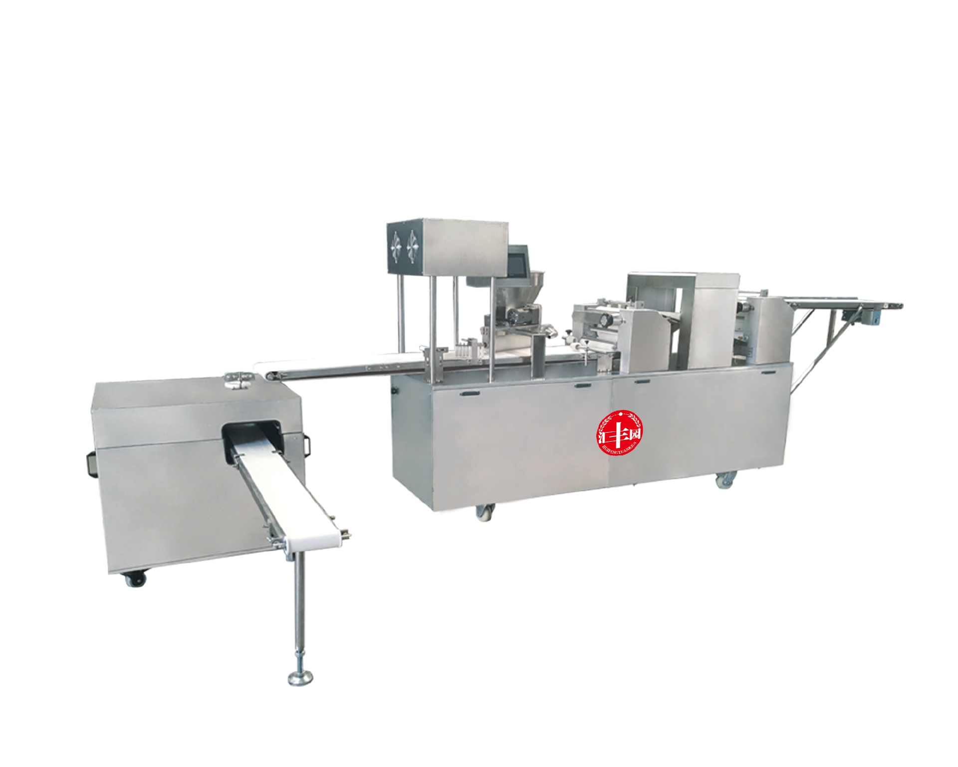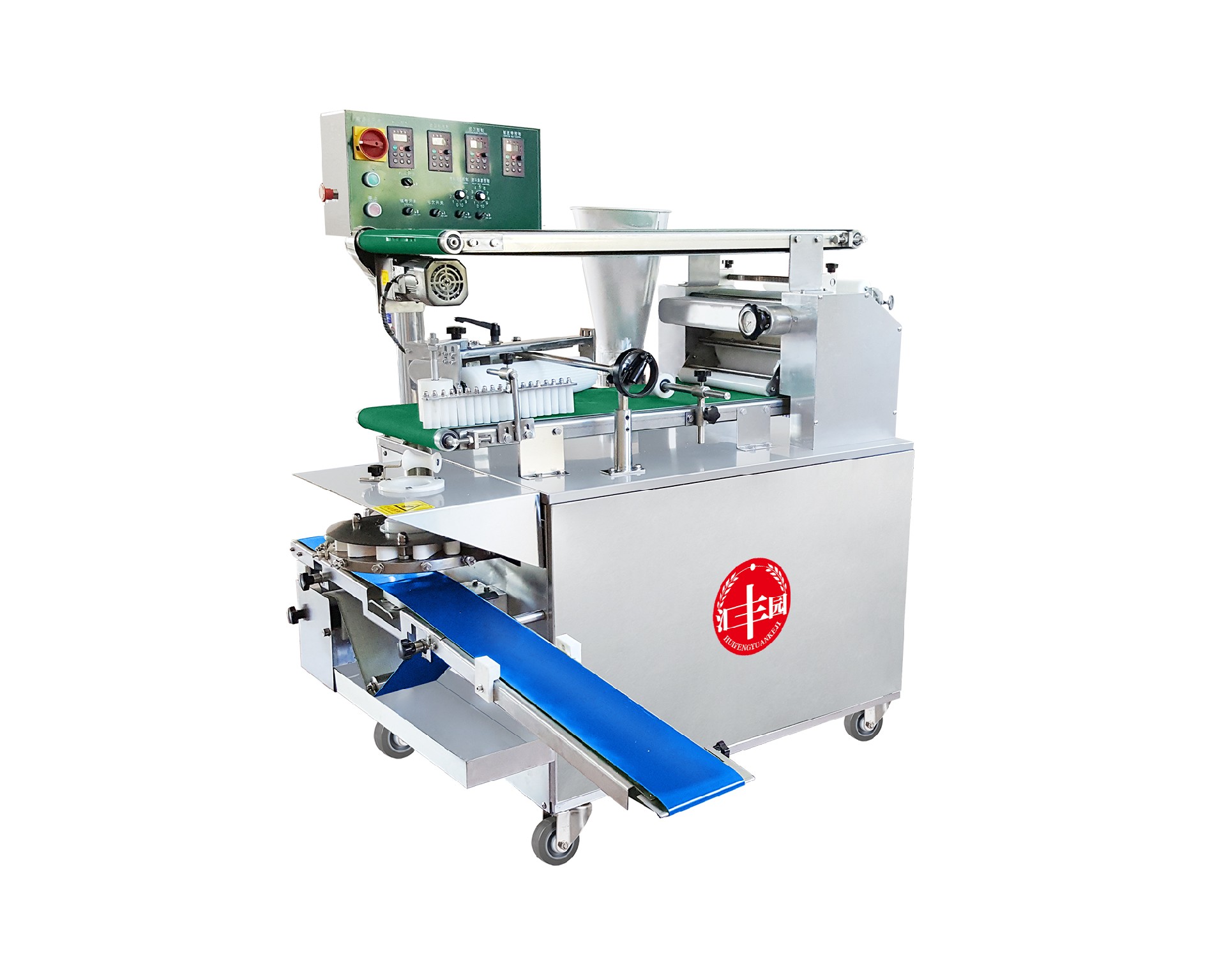 仿手工包子机采用仿手工擀面的方式将面皮压成合适厚度。再由出馅部分将馅料填充至面皮上,经由卷面部分卷成圆柱形状,传送至成型部分成型,过程中不会破坏面皮筋性,保持手工原味。全机的工作部分主要由:送面系统、压面系统、送馅系统、卷面系统、成型等五部分组成。工作流程:供馅料斗-〉供面斗)-〉包制-〉切断成型-〉传送带-〉醒发-〉蒸制;优势:自带压面系统,采用压面辊渐进仿手工擀面方式将面皮压成合适厚度,整个过程不会破坏面皮筋性。面皮柔软筋道。 可加配值可生产:馅饼和方型馒头、圆馒头等。成型盘采用轴承传送,配合刀块张合防止以前包子机做大包子成型堵面现象。有9褶或12褶和16褶花型供用户选择,进口高分子材料刀块利用科学原理均衡受力减小,解决了其它包子机成型刀块靠一块主刀推动其它副刀运动易磨损,刀夹面粘面,易受天气变化而热胀冷缩不能正常生产的难题,促进机器稳定延长使用寿命。
